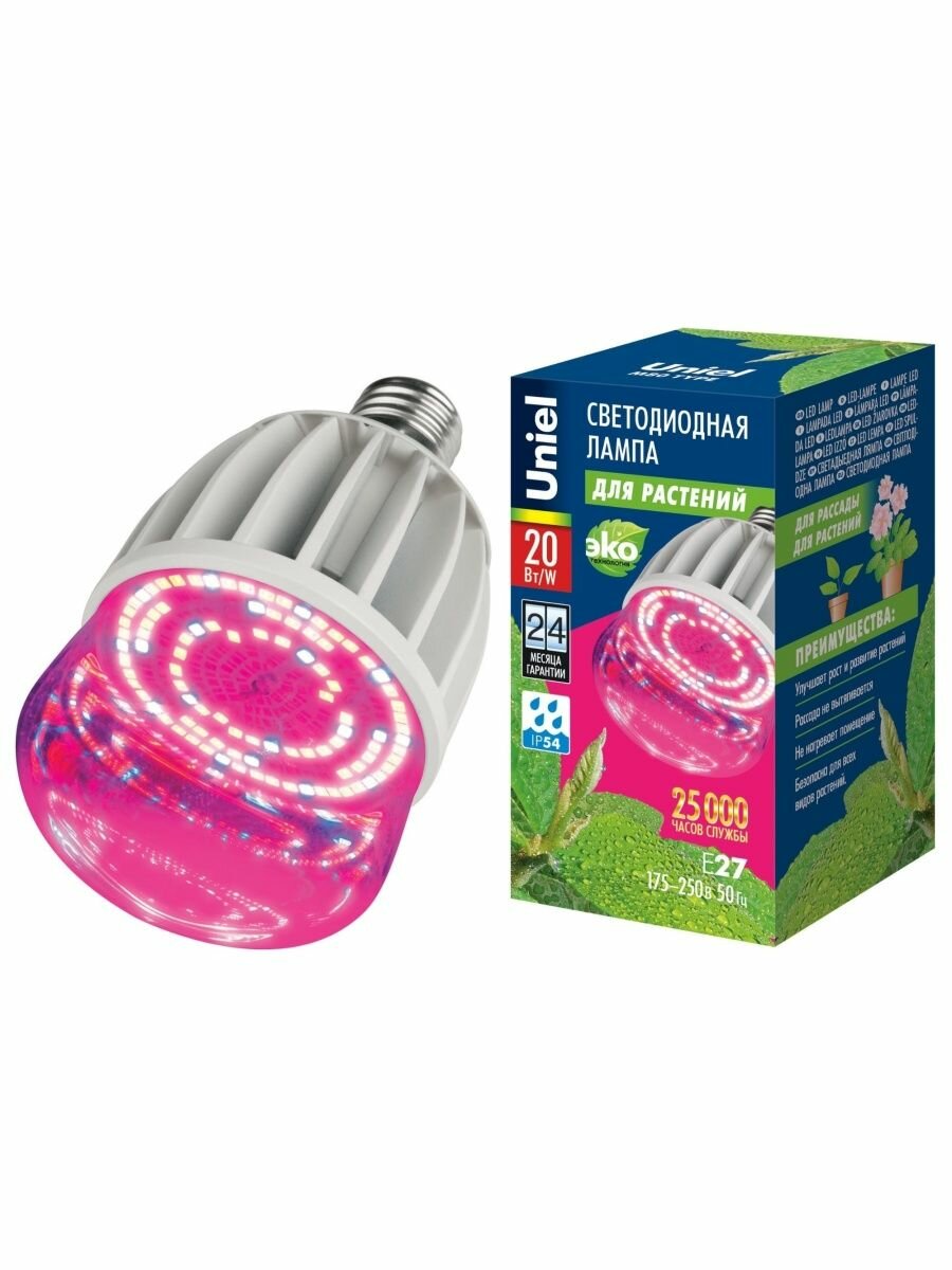 Лампа светодиодная для растений Uniel ALS55WH, E27, M80, 20Вт