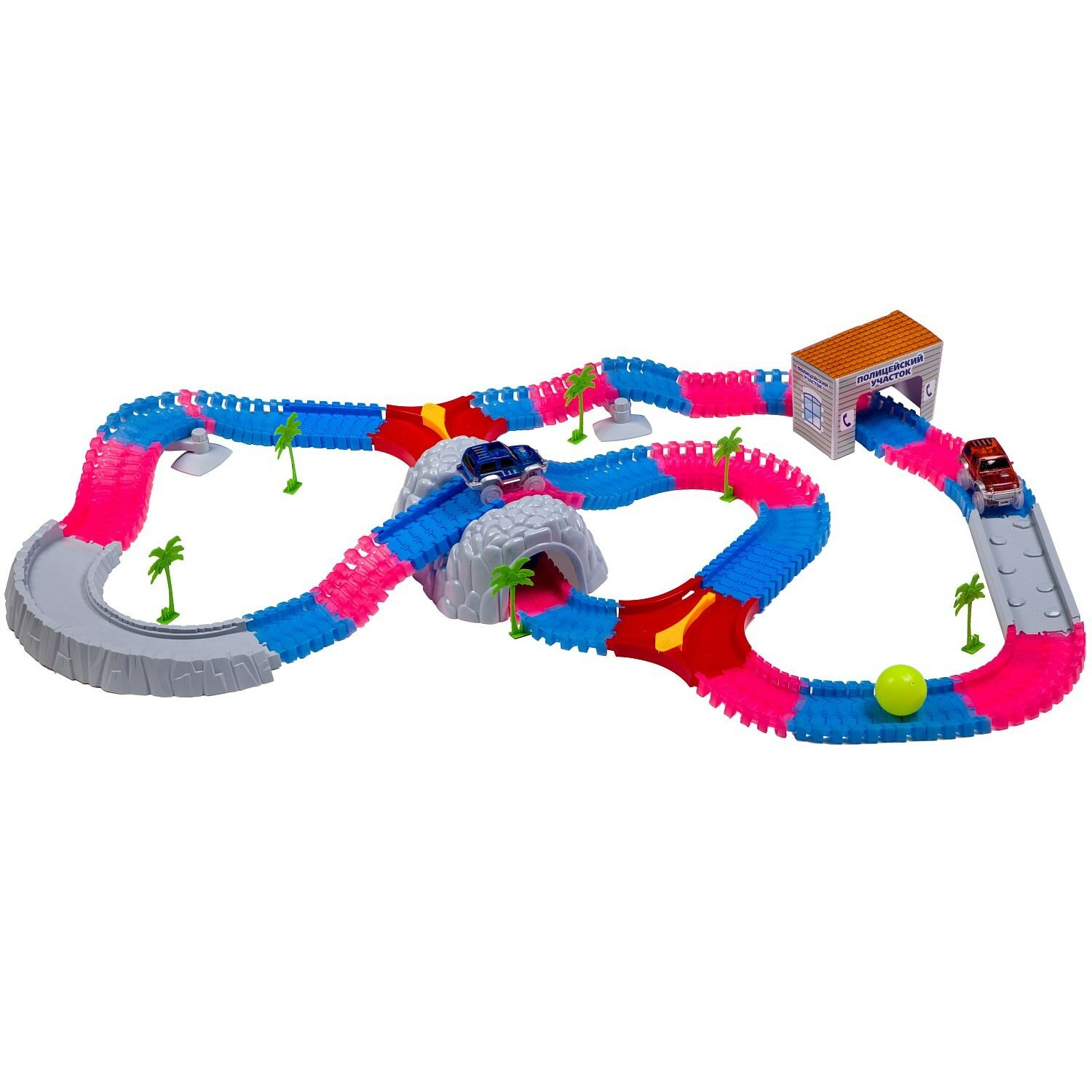 | Комплектация | - детали для сборки дамбы 6 шт.; - тоннель 1 шт.; - деревья 6 шт.; - стрелка-перевод 2 шт.; - шар 1 шт.; - флуоресцентная деталь для сборки дороги 175 шт.; - набор наклеек; - полицейский участок 1 шт.; - светящиеся машинки 2 шт. |