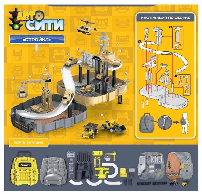 | Комплектация | - рюкзак (раскладывается в основу строительной площадки); - детали для сборки трека; - кран; - машинки. |