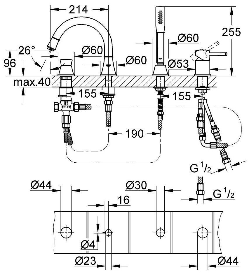 Grohe Grandera 19936 000 Смеситель для ванны (монтаж на бортик ваны на 4 отверстия)