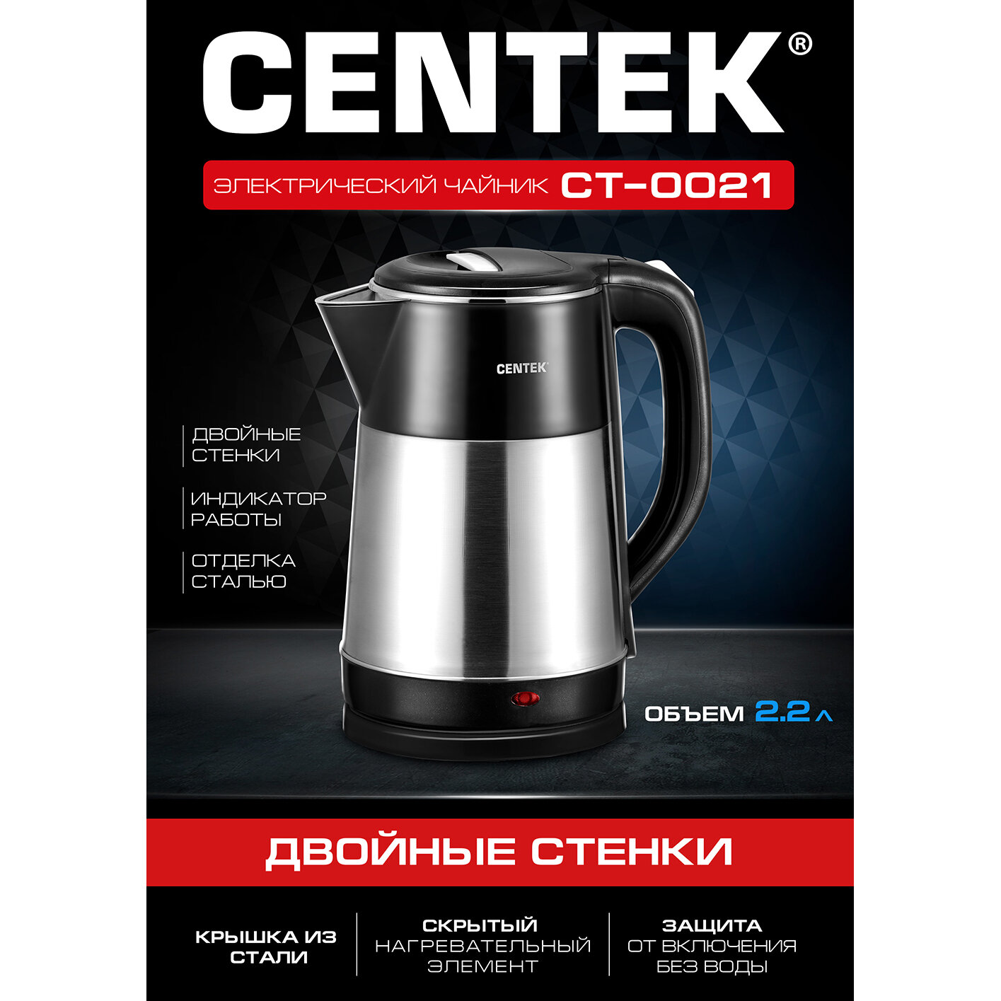 0021-CT Centek Чайник 2,2л, 2000 Вт, пластик/нержавеющая сталь, двойные стенки