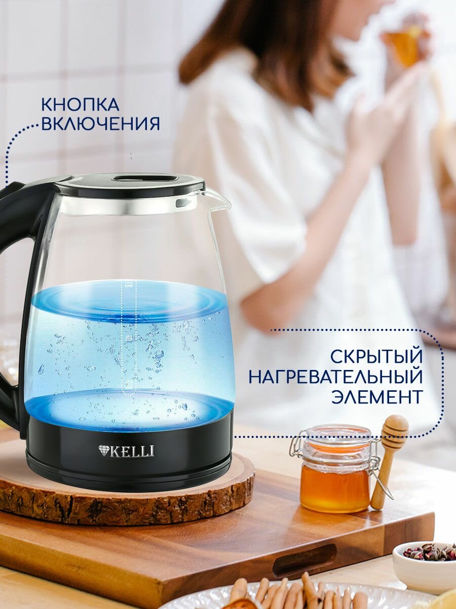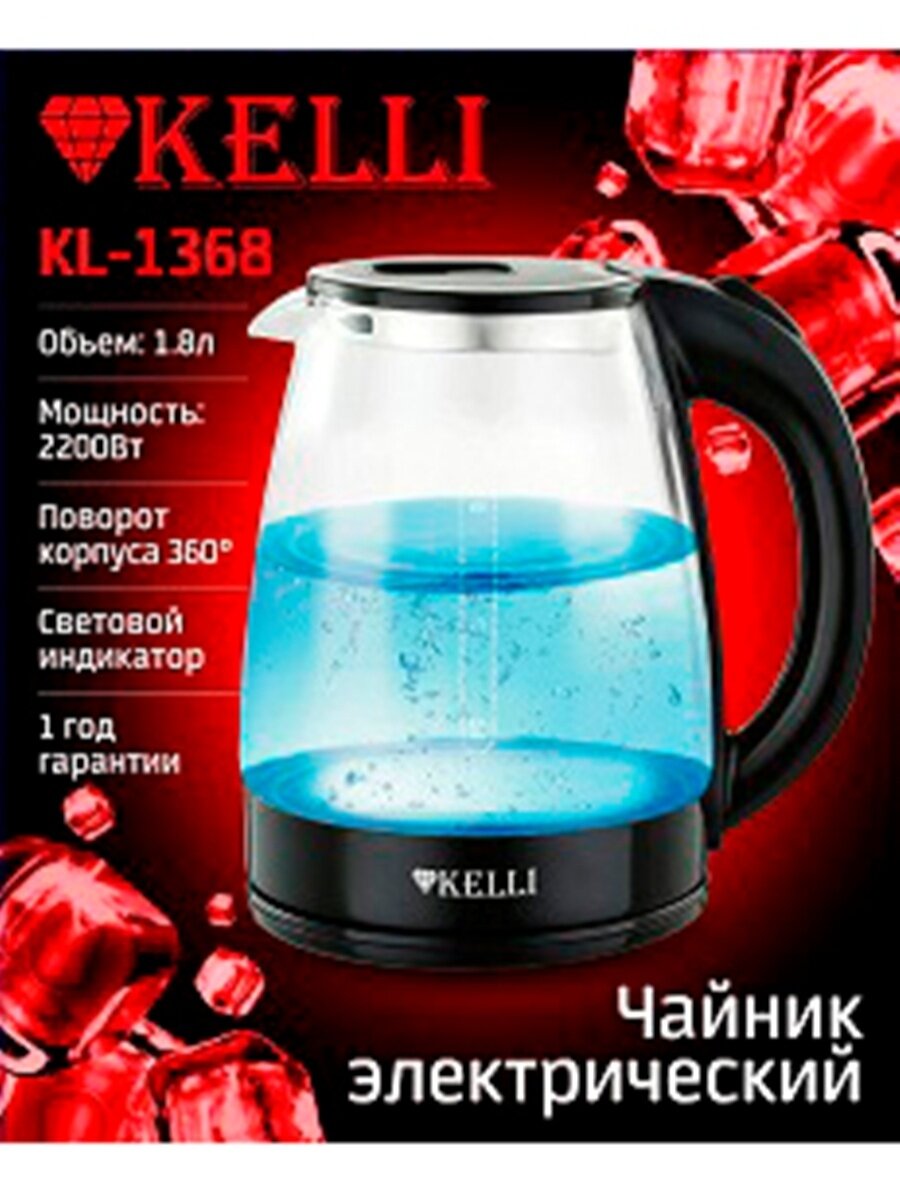 Чайник электрический KELLI KL-1368 1,8 л, 2200 Вт, стекло/черный