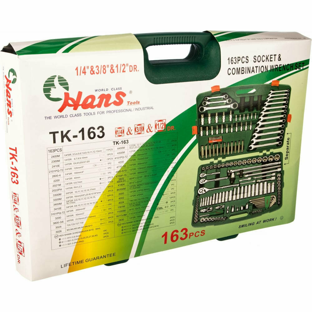 Hans Набор инструмента универсальный 1/4", 3/8", 1/2", головки длин, ключи угловые, биты, 163 пр. TK-163