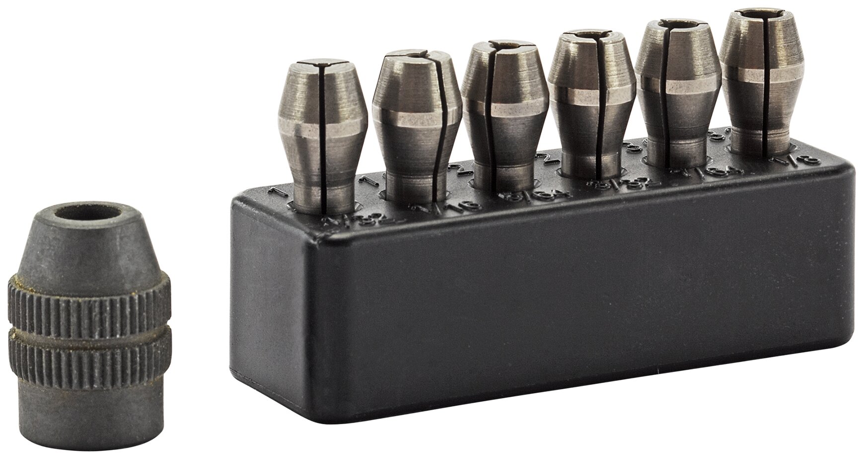 | Комплектация | цанговый зажим, трехлепестковые цанги 6шт. (1.0 - 1.5 - 2.0 - 2.4 - 3.0 - 3.2 мм) |