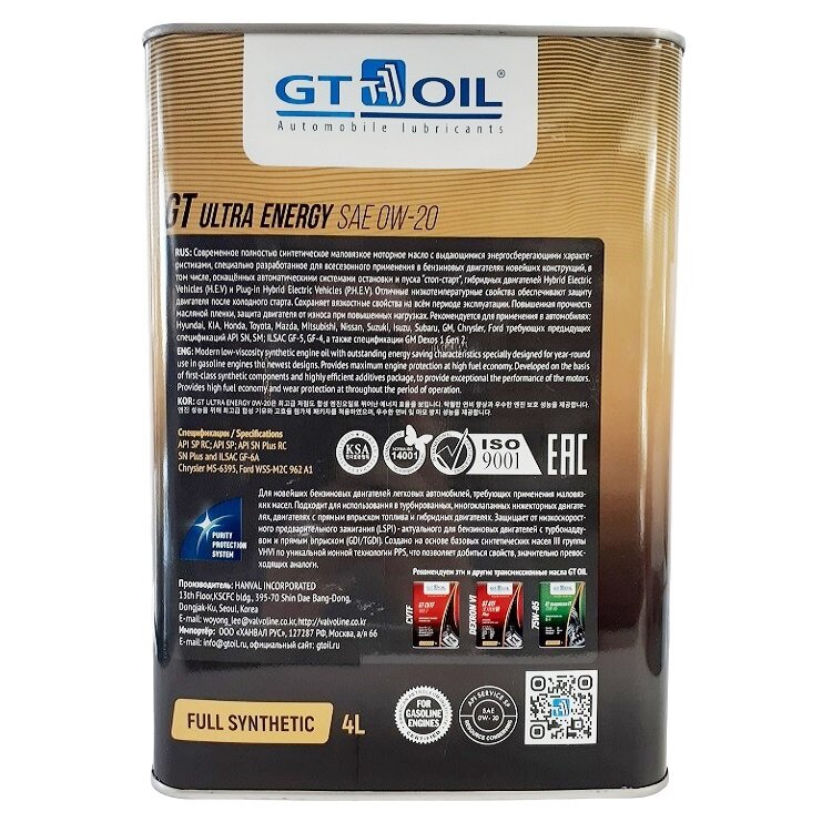 Масло моторное gt oil gt ultra energy 0w-20 api sp/gf-6a синтетическое 4 л 8809059408902