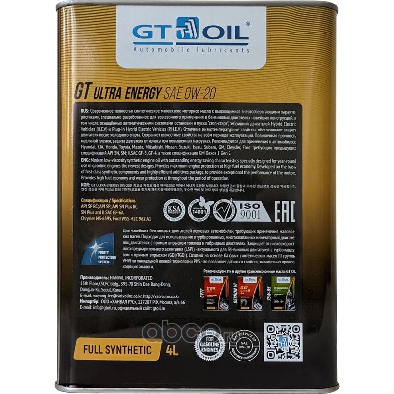 СохранитьGT OIL Масло Ultra Energy, SAE 0W-20, API Sn/gf-5, 4л 8809059408902 . интересное: