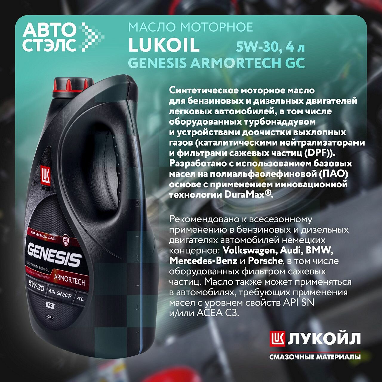 лукойл genesis armortech gc 5w-30 (1л) api sn acea c3 vw 504 00/507 00 bmw ll-04 mb-approval 229.51 porsche c30