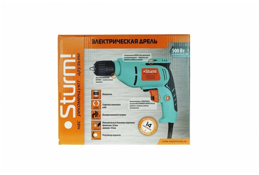 Купить ID2151 Дрель электрическая 500Вт, реверс, 0-3200об/мин, быстрозажимной патрон 10 мм, Sturm!