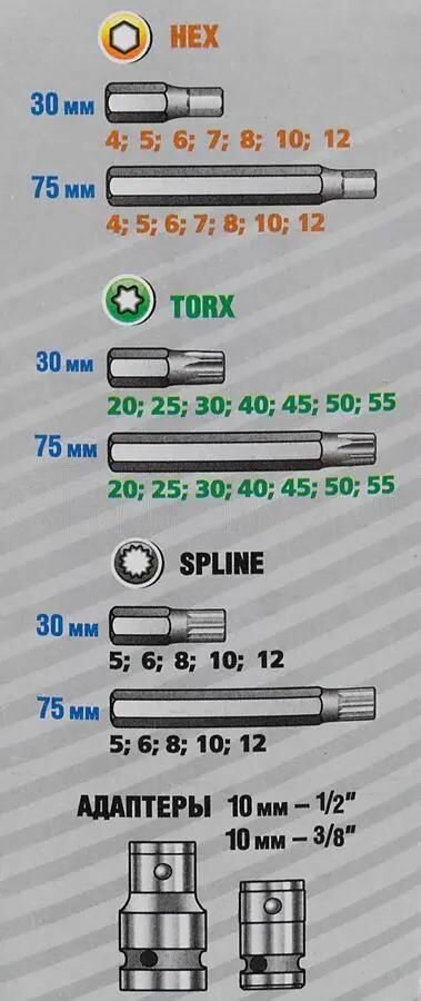 | Биты подробно | 30 мм: HEX4, HEX5, HEX6, HEX7, HEX8, HEX10, HEX12, T20, T25, T30, T40, T45, T50, T55; Spline: 5, 6, 8, 10, 12; 75 мм: HEX4, HEX5, HEX6, HEX7, HEX8, HEX10, HEX12, T20, T25, T30, T40, T45, T50, T55; Spline: 5, 6, 8, 10, 12 |