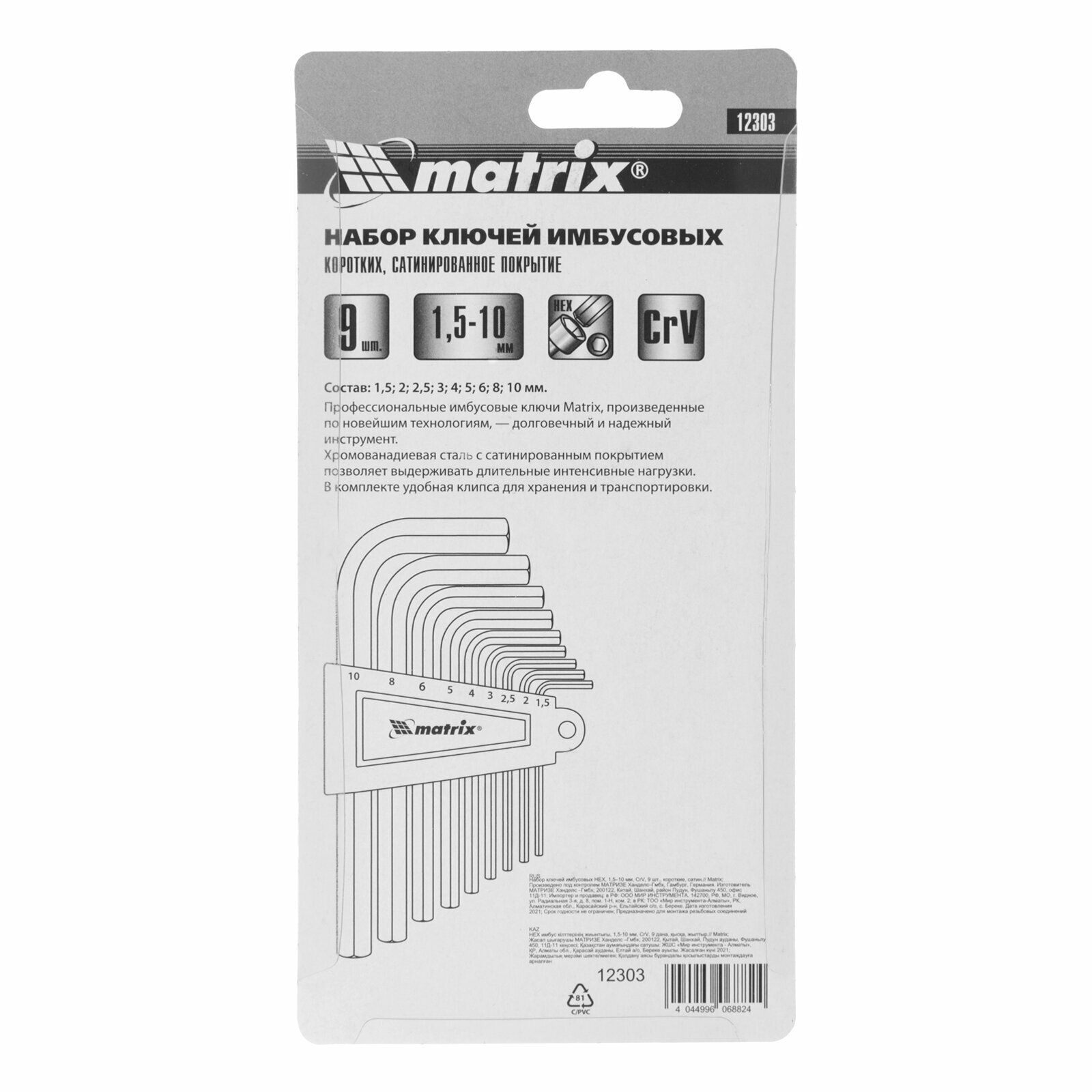 Набор ключей имбусовых HEX, 1,5–10 мм, CrV, 9 шт., короткие, сатин., MATRIX 12303