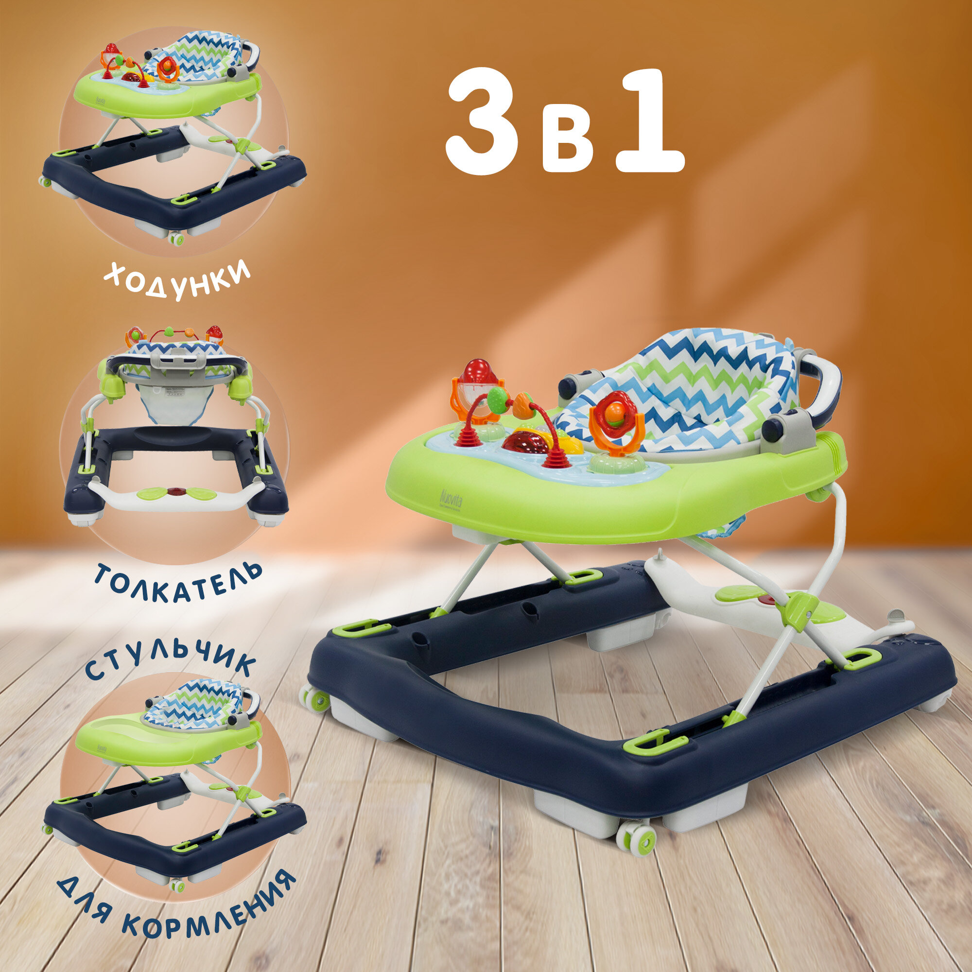 Купить Ходунки детские Nuovita Avanti 3 в 1: ходунки, стульчик для кормления, толкатель(Blu Verde/Сине - зеленый)