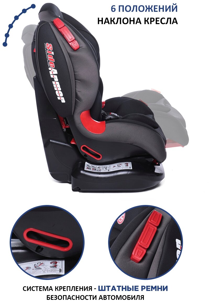 | Плюсы: | Удобно ребёнку, длинные регулируемые ремни, дополнительная защита от боковых ударов. |
