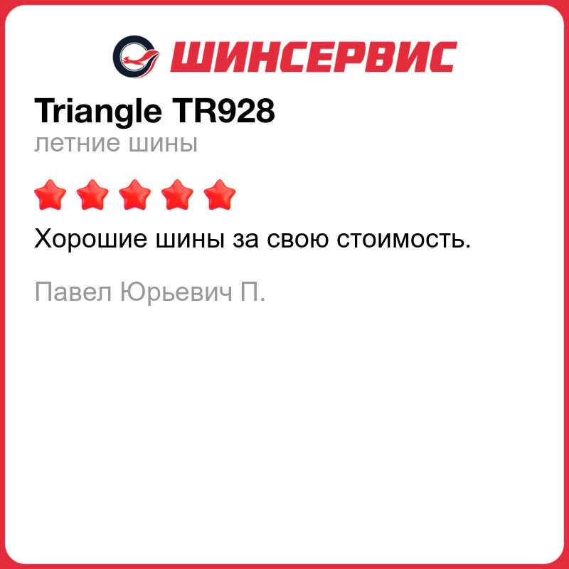 | Отзыв: | Купил Триангл 928 R16 215 65 по 2500р за шину, до этого стоял Hankook, и сразу же отправился их тестировать на КАД, могу сказать что до 160 км/ч они себя показали с лучшей стороны, шума нет, дорогу держат отлично, в дождь пока не ездил, ну думаю они тоже будут на высоте, доволен покупкой! |