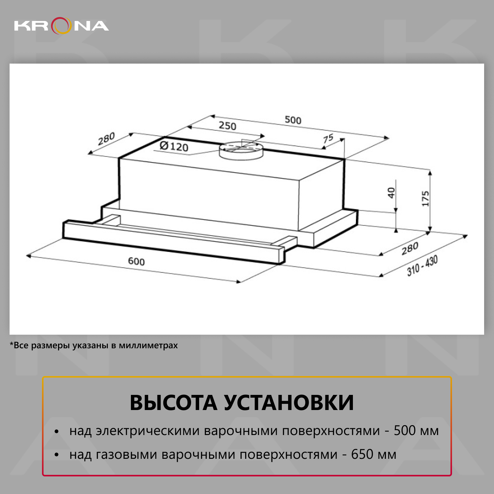 Вытяжка встраиваемая Krona Kamilla 600 W (2 мотора)