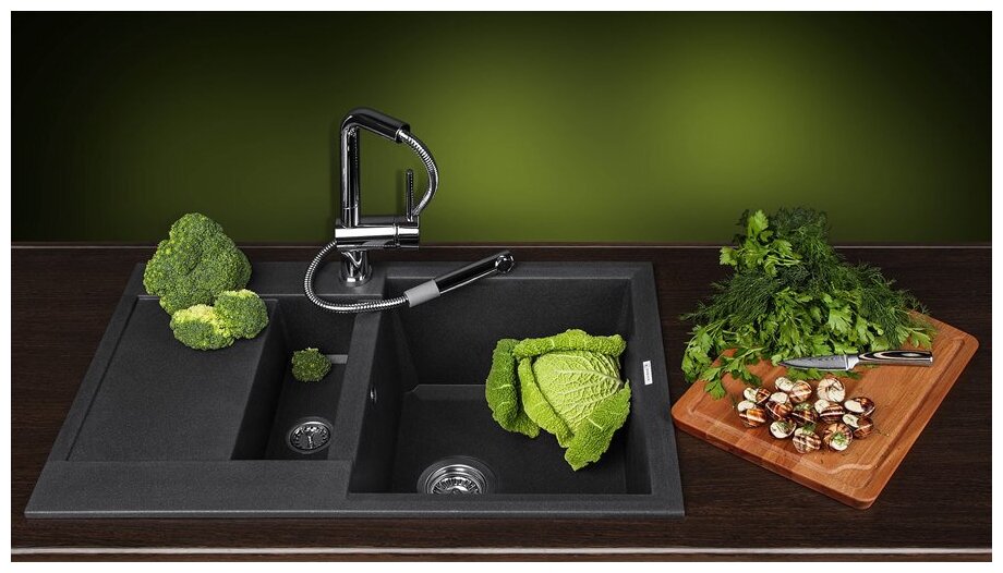 | Плюсы: | Двусторонняя, можно крутить крыло в нужную вам сторону (справа или слева), несколько установочных мест под кран, второй отсек для мытья овощей-фруктов, там же можно поставить измельчитель. |