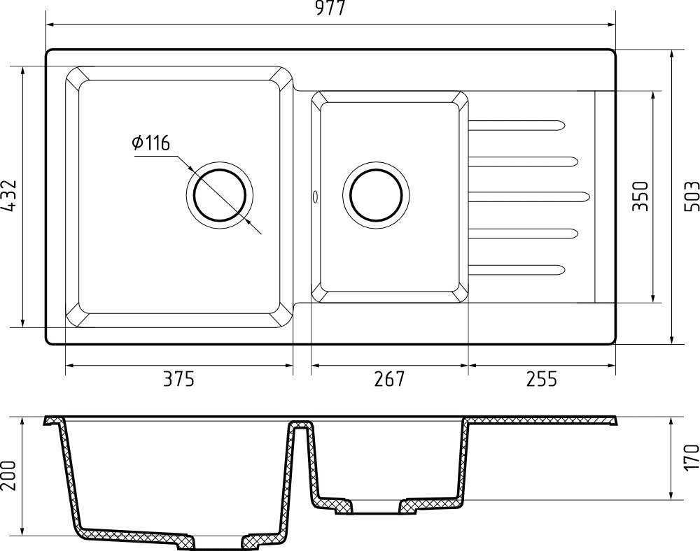 Мойка GRANFEST GF-P980KL 2 чаши+крыло 980х510мм (черный-308)
