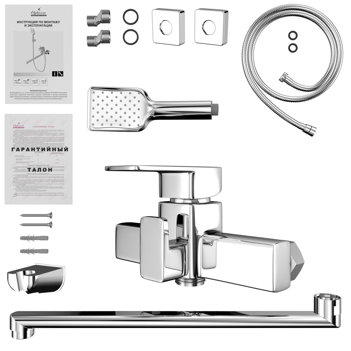| Комплектация | смеситель - 1шт / излив плоский - 1 шт / настенный кронштейн - 1 шт / пластиковая душевая лейка - 1 шт / душевой шланг - 1 шт / эксцентрики / набор декоративных колпаков |