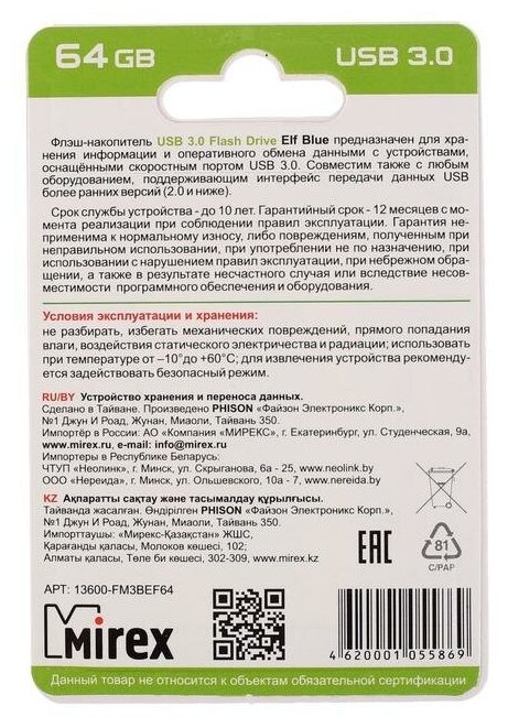 Флешка 64Gb Mirex Elf USB 3.0 синий 13600-FM3BEF64