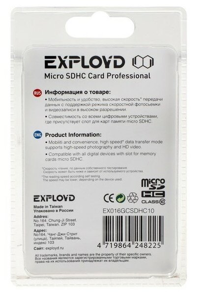 Карта памяти (EXPLOYD MicroSDHC 16GB Class10 + адаптер SD)