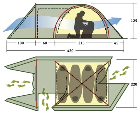 | Плюсы: | три входа, противомоскитная сетка, вместительная внутри, с большим тамбуром |