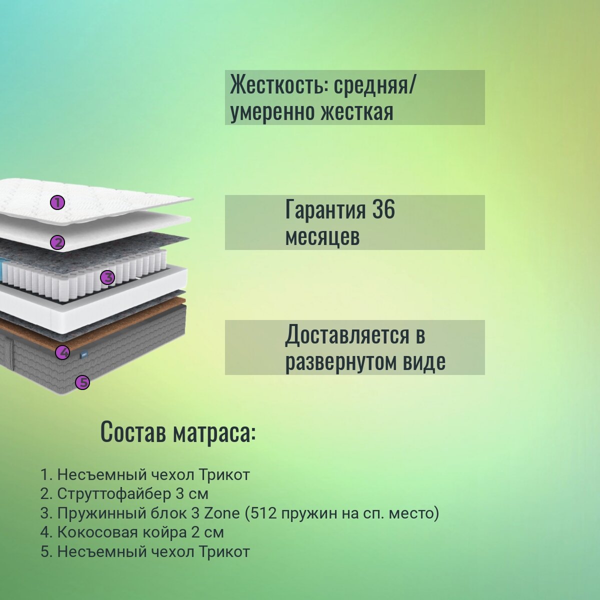 Матрас имеет независимые пружинные блоки, что делает его безшумным, долговечным. Натуральные наполнители позволяют телу дышать и обладают ортопедическими свойствами. Ткань поверхности очень приятная. Имеет 2 уровня жесткости-средняя и выше среднего. Матрас доставили до дверей в свернутом виде, после распаковки принял нормальную форму в течении 3 часов. Матрас действительно комфортный и удобный. Первая ночь доказала это, спала как ангел, проснулась без боли в спине, чего давно не было в связи со сколиозом и межпозвоночными грыжами. Спасибо за отзывы, которые помогли мне в выборе и производителю за мой крепкий сон теперь! Теперь надо искать подушку) |