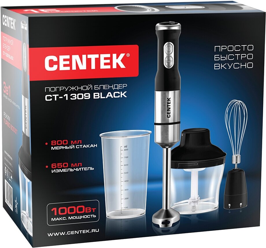 Блендер Centek CT-1309 Black, 1000Вт, рег скорости, стакан, чоппер, венчик, черный
