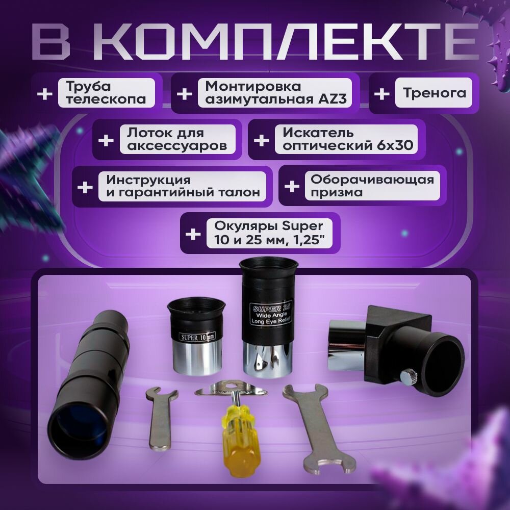 | Комплектация | труба телескопа 180х90, окуляр 25 мм, 10 мм, диагональное зеркало 45°, оптический искатель 6x30, азимутальная монтировка AZ3, тренога |