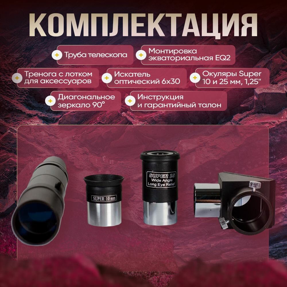 | Комплектация | труба телескопа, окуляры 25 мм и 10 мм, диагональное зеркало 90°, оптический искатель 6x30, экваториальная монтировка EQ2, тренога |