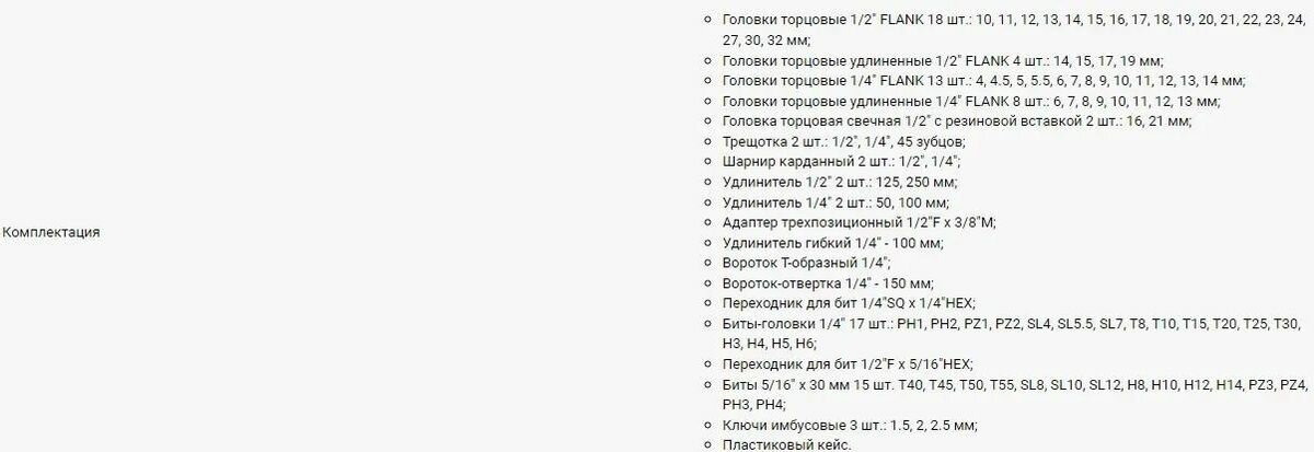 | Головки торцевые подробно | 1/2": 10, 11, 12, 13, 14, 15, 16, 17, 18, 19, 20, 21, 22, 23, 24, 27, 30, 32 мм; длинные 1/2": 14, 15, 17, 19 мм; 1/4": 4, 4.5, 5, 5.5, 6, 7, 8, 9, 10, 11, 12, 13, 14 мм; длинные 1/4": 6, 7, 8, 9, 10, 11, 12, 13 мм; свечные 1/2": 16, 21 мм; трещотка 1/2", 1/4": 45 зубов; карданный шарнир 1/2", 1/4"; удлинитель 1/2": 125, 250 мм; удлинитель 1/4": 50, 100 мм; гибкий удлинитель 1/4": 100 мм; вороток т-образный 1/4"; с битами 1/4": PH1, PH2, PZ1, PZ2, SL4, SL5.5, SL7, T8, T10, T15, T20, T25, T30, H3, H4, H5, H6; адаптер 1/2"(F)х3/8"(M) |