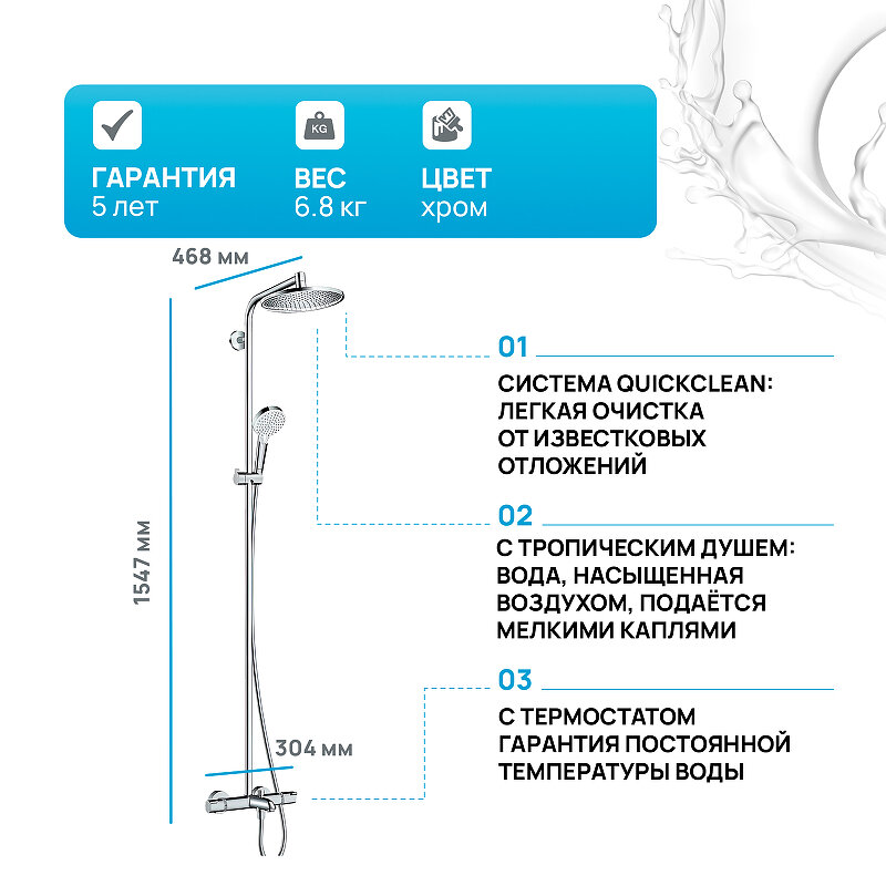 | Дополнительная информация | высота стойки для душа: 1547 мм; диаметр душевой лейки: 100 мм; диаметр верхнего душа: 240 мм |