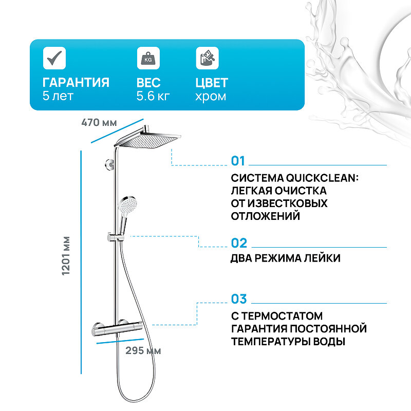 | Дополнительная информация | высота стойки для душа: 1201 мм; диаметр душевой лейки: 100 мм; длина верхнего душа: 240 мм; ширина верхнего душа: 240 мм; длина держателя верхнего душа: 350 мм; предохранительный ограничитель при 40°C; регулируемое по высоте крепление ручного душа; подъемная труба может быть укорочена по высоте; типы струй верхнего душа: Rain; тип струи ручной душ: Rain, IntenseRain; с термостатическим смесителем; страна: Германия |