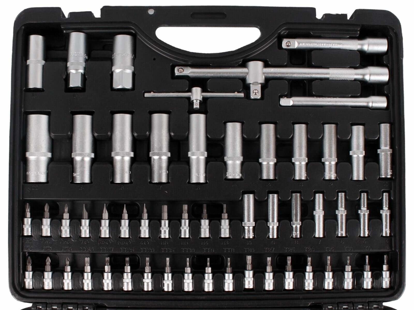 | Головки торцевые подробно | 1/4": 4, 4.5, 5, 5.5, 6, 7, 8, 9, 10, 11, 12, 13, 14 мм; длинные 1/4": 4, 5, 6, 7, 8, 9, 10 мм; Torx 1/4": E4, E5, E6, E7, E8; с… битами 1/4": H3, H4, H5, H6, T8, T9, T10, T15, T20, T25, T27, T30, T8H, T9H, T10H, T15H, T20H, T25H, T27H, T30H, SL4, SL5.5, SL6.5, SL7, PH0, PH1, PH2, PZ0, PZ1, PZ2; трещотка 1/4"; вороток т-образный 1/4"; удлинитель 1/4": 50, 100 мм; карданный шарнир 1/4"; 3/8": 10, 11, 12, 13, 14, 15, 16, 17, 18, 19 мм; длинные 3/8": 10, 11, 12, 13, 14, 15 мм; Torx 3/8": E10, E11, E12, E14, E16, E18, E20, E24; свечная 3/8": 18 мм; трещотка 3/8"; удлинитель 3/8": 125 мм; карданный шарнир 3/8"; 1/2": 10, 11, 12, 13, 14, 15, 16, 17, 18, 19, 20, 21, 22, 24, 27, 30, 32 мм; длинные 1/2": 16, 18, 22 мм; ударные 1/2": 17, 19 мм; свечные 1/2": 16, 1 мм; трещотка 1/2"; удлинитель 1/2": 125, 250 мм; карданный шарнир 1/2" ещёскрыть |