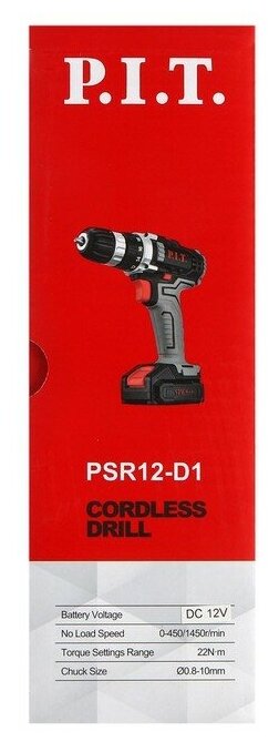 Дрель-шуруповерт P.I.T. PSR 12-D1, 12 В, 2х1.5 Ач, Li-lon, 450/1450 об/мин, 22 Нм, реверс P.I.T. 452