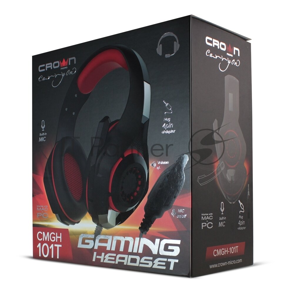 CROWN CMGH-101T Black&red (Подключение jack 3.5мм 4pin+ адаптер 2*jack spk+mic,Частотныи? диапазон: 20Гц-20,000 Гц ,Кабель 2.1м,Размер D 250мм, регулировка громкости, микрофон на ножке)