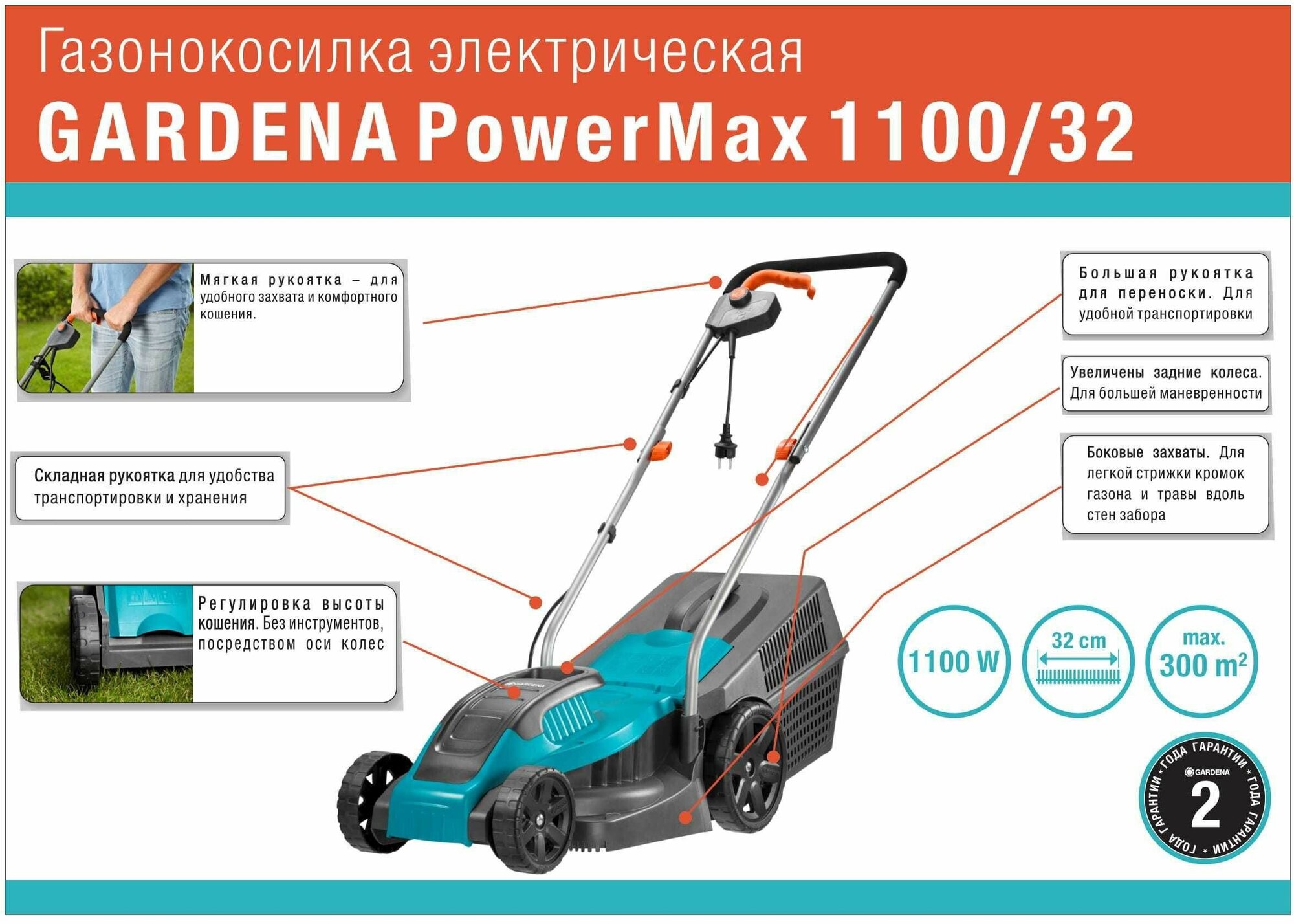 Газонокосилка электрическая Gardena PowerMax 1100/32, 1100 Вт, 30 л