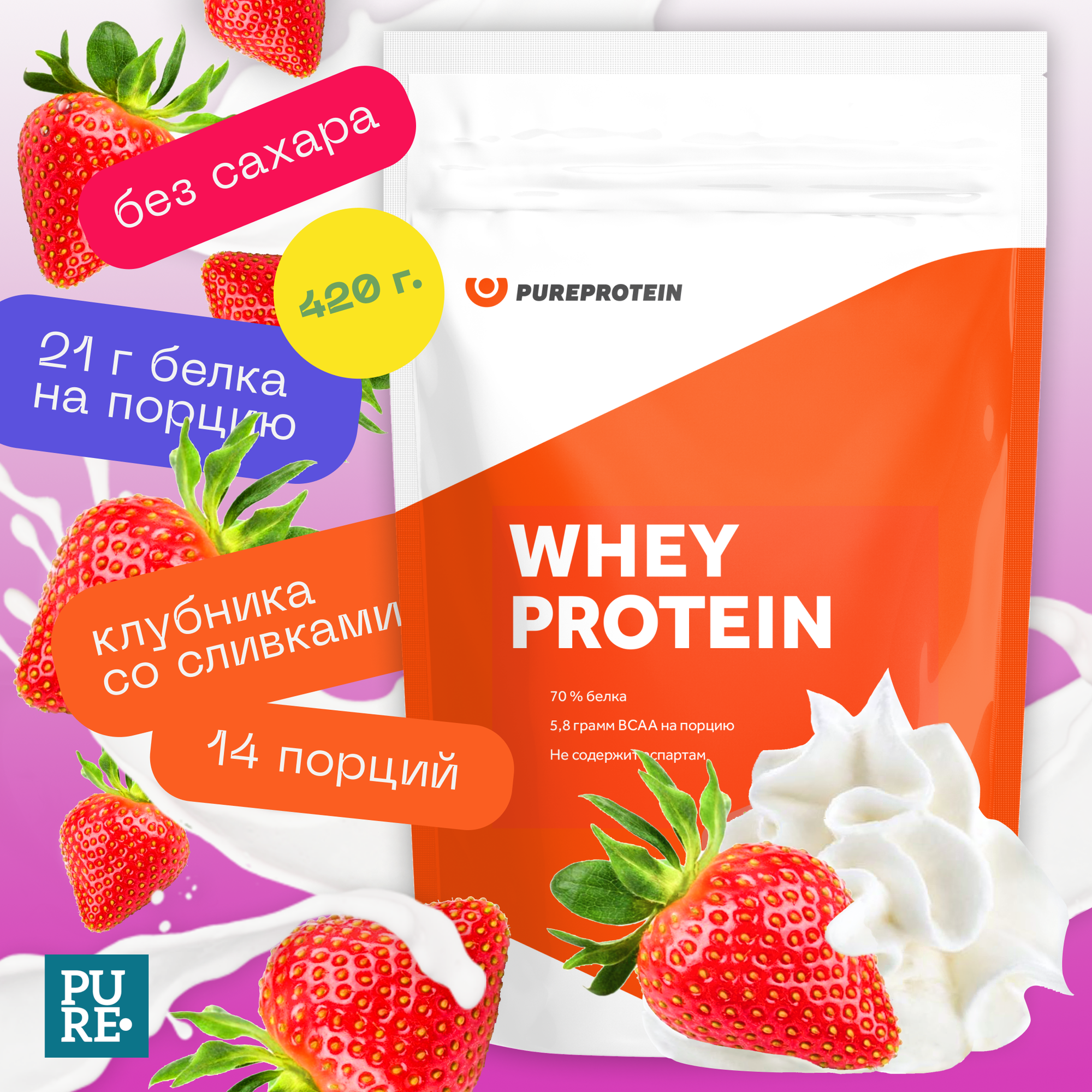 Протеин Pure Protein Whey Protein, 420 гр., клубника со сливками