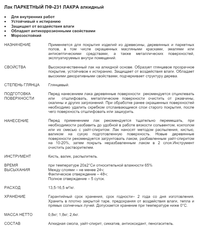 Ниже Вы можете прочитать отзывы на Лак паркетный Лакра ПФ-231 1,8кг, ознакомится с подробными характеристиками, посмотреть интересные обзоры и фотографии на Лак паркетный Лакра ПФ-231 1,8кг.