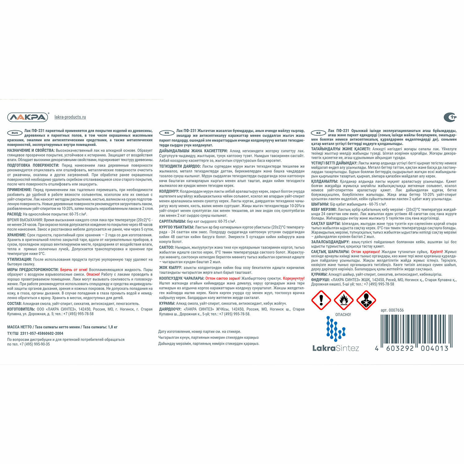 Лак ПФ-231 паркетный Лакра 1,8 кг