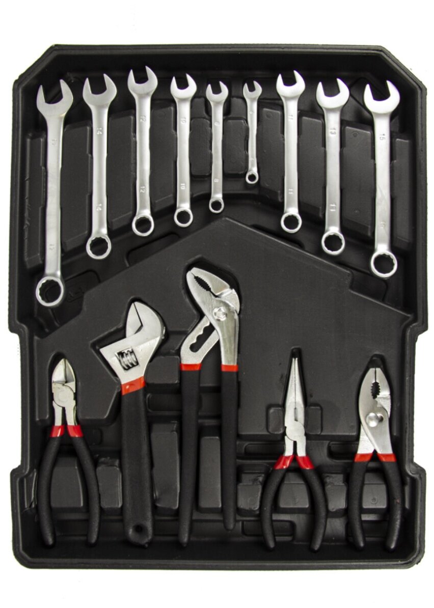 | Гаечные ключи подробно | клещи переставные 250 мм; разводной ключ 200 мм; комбинированные ключи: 6, 8, 10, 11, 12, 13, 14, 15, 17 мм |