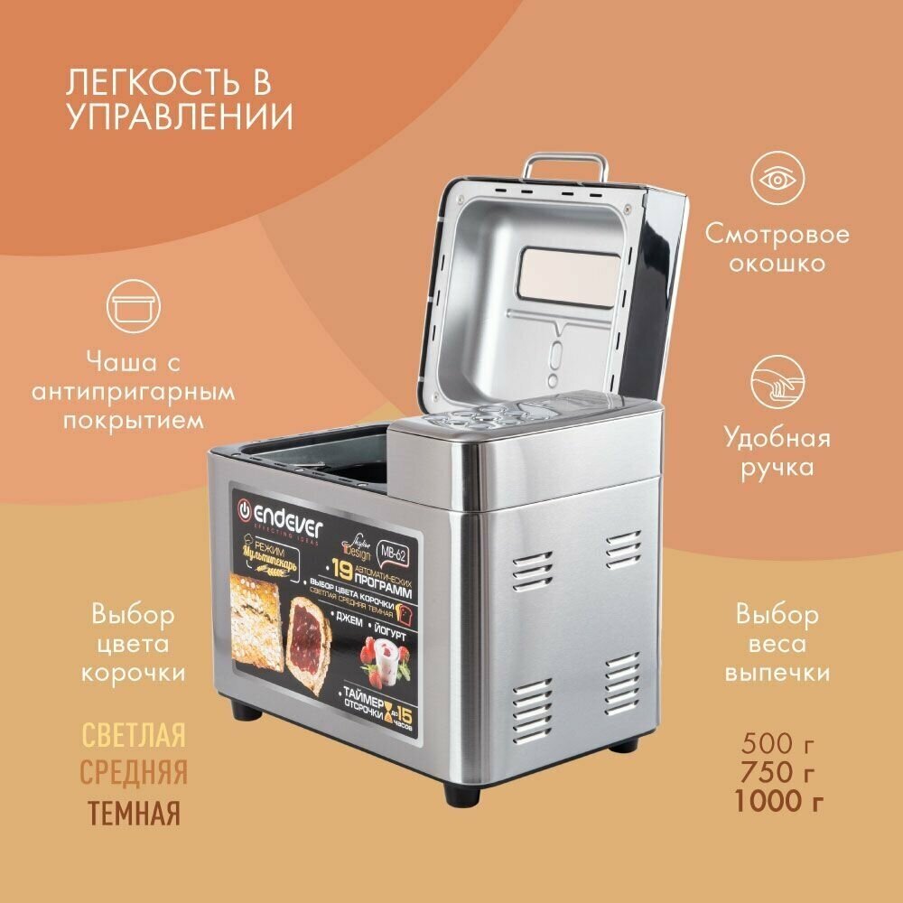 Хлебопечка ENDEVER MB-62, мне понравилась сразу. Приятный и в то же время сдержанный и строгий дизайн, многофункциональная и понятная панель управления, тихая и устойчивая. Руководство пользователя на русском языке, рецептура оптимальная и главное работает с первого применения. Удобная в обслуживании, легко очищается, довольно компактна для хранения.