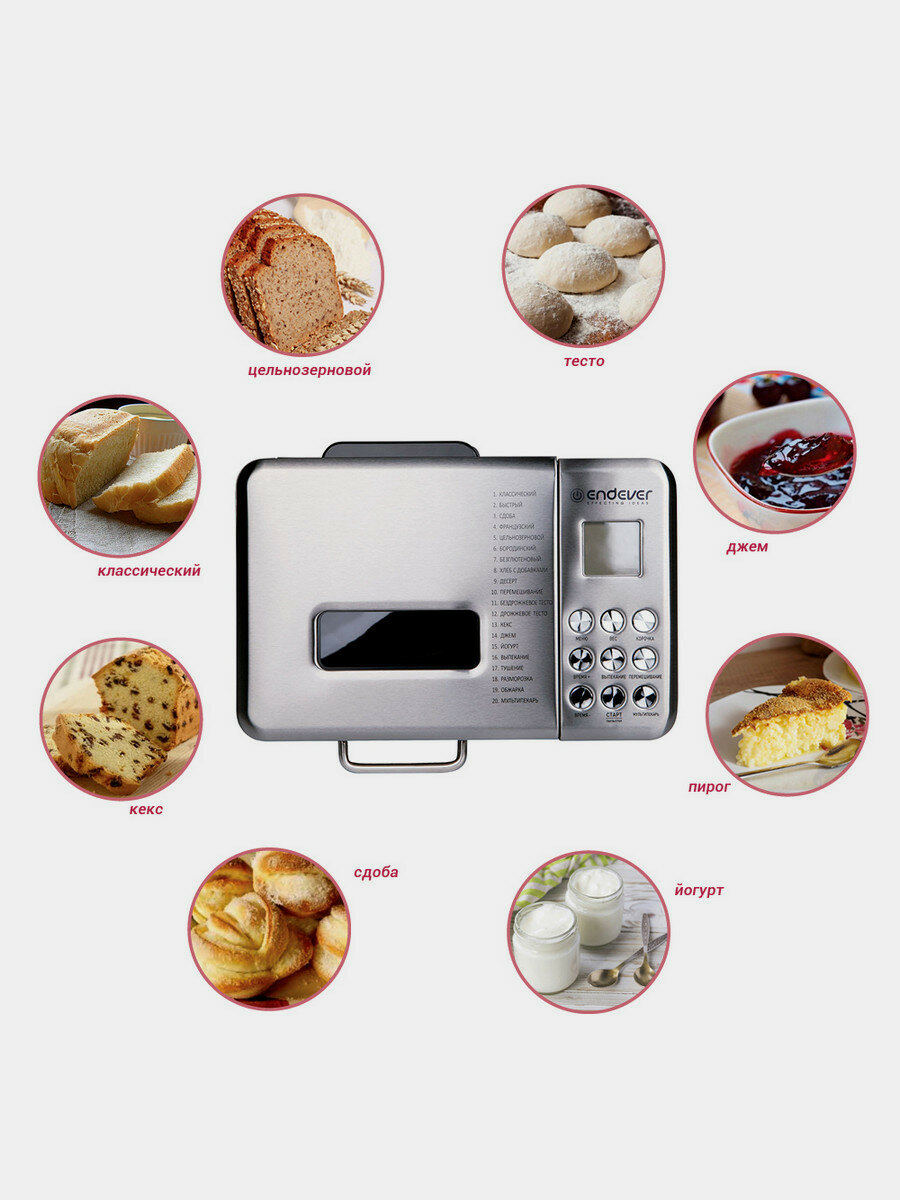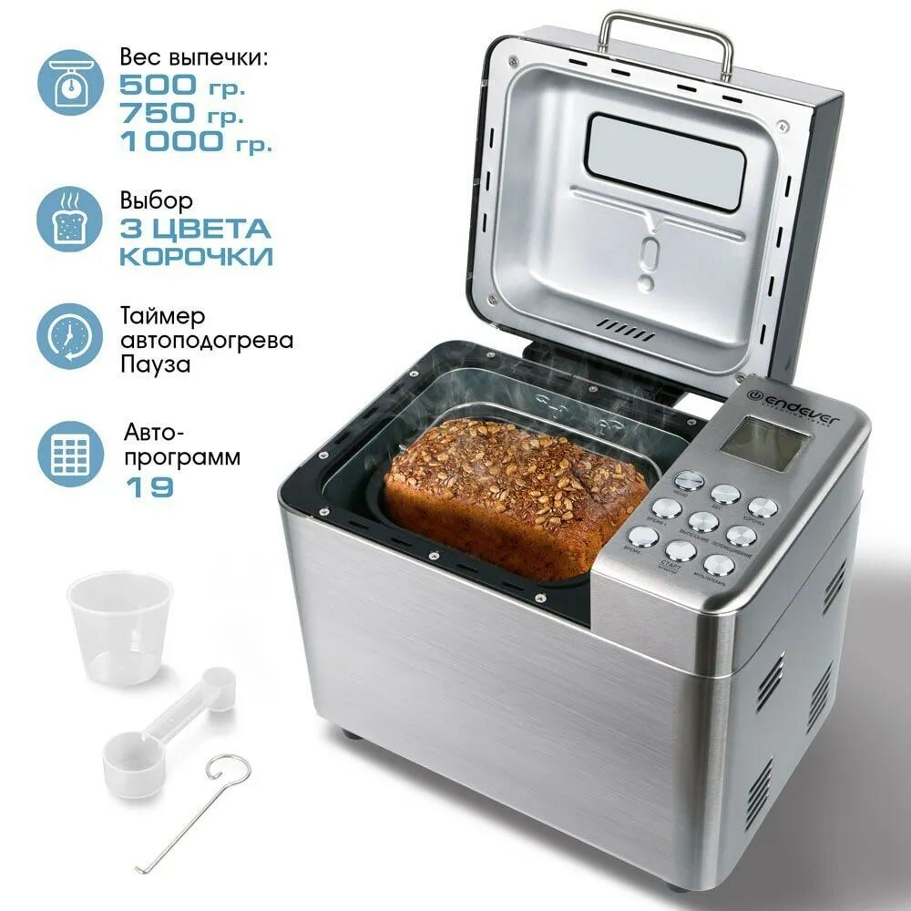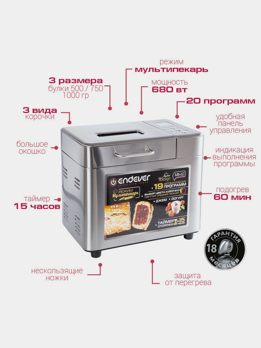 Хлебопечка с замесом теста Endever MB-62 / 19 автоматических программ + мультипекарь / выпечка 500/750/1000 грамм