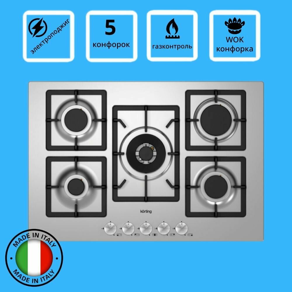 Газовая варочная панель Korting HG 797 CTX, нержавеющая сталь, 75 см, 5 конфорок, газ-контроль, электроподжиг, чугунные держатели для посуды, экспресс-конфорка, безопасное управление, подставка WOK+адаптер для кофейника