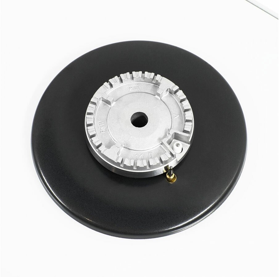 | Плюсы: | Толстое белое закаленное стекло, WOK конфорка, чугунная решётка. |