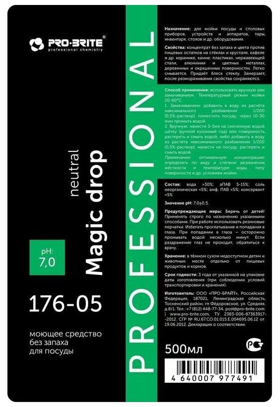 СохранитьМоющее средство без запаха для посуды 176-05 Magic Drop Neutral 500мл Pro-Brite интересное: