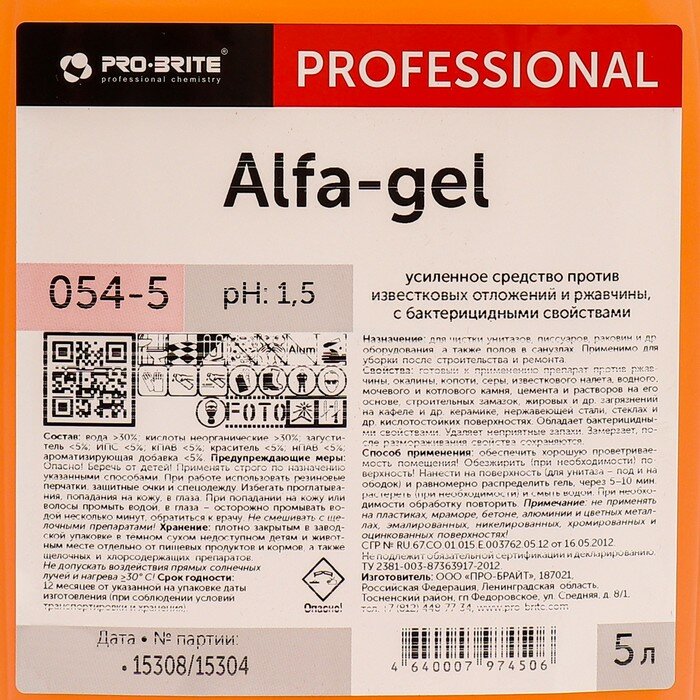 Средство против известковых отложений и ржавчины 054-5 Alfa-gel 5л Pro-Brite