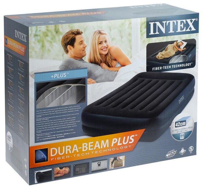 Надувная кровать 152x203x42 см, двухспальная, встроенный электрический насос 220В от сети, нагрузка до 273 кг, флокированное покрытие, Dura-Beam Plus, intex 64124