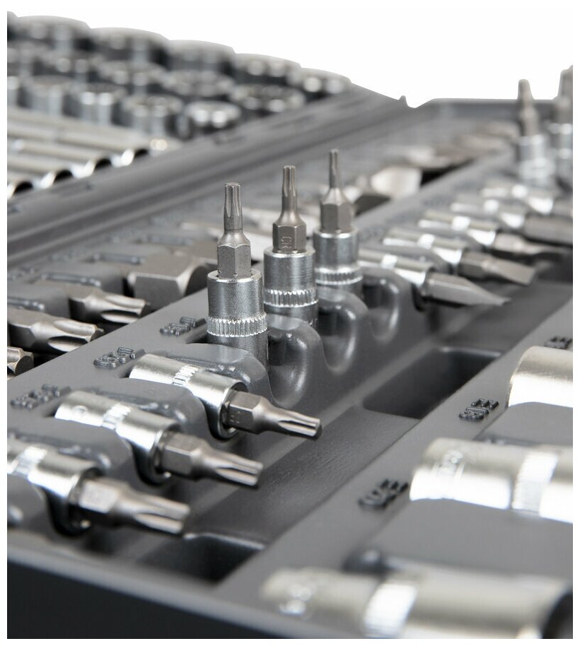 | Головки торцевые подробно | 1/2" (12-гр): 10, 11, 12, 13, 14, 15, 16, 17, 18, 19, 20, 21, 22, 24, 27, 30, 32 мм; длинные 1/2" (12-гр): 14, 15, 17, 19, 22 мм; Torx 1/2": E10, E11, E12, E14, E16, E18, E20, E24; карданный шарнир 1/2"; свечные 1/2": 16, 21 мм; удлинитель 1/2": 125, 250 мм; трещотка 1/2": 72 зуба; 1/4" (12-гр): 4, 4.5, 5, 5.5, 6, 7, 8, 9, 10, 11, 12, 13, 14 мм; длинные 1/4" (12-гр): 6, 7, 8, 9, 10, 11, 12, 13 мм; Torx 1/4": E4, E5, E6, E7, E8; удлинитель 1/4": 50, 100 мм; вороток т-образный 1/4"; карданный шарнир 1/4"; трещотка 1/4": 72 зуба; с битами 1/4": T8, T10, T15, T20, T25, T27, T30, H3, H4, H5, H6, SL4, SL5.5, SL6.5, PH1, PH2, PZ1, PZ2 |