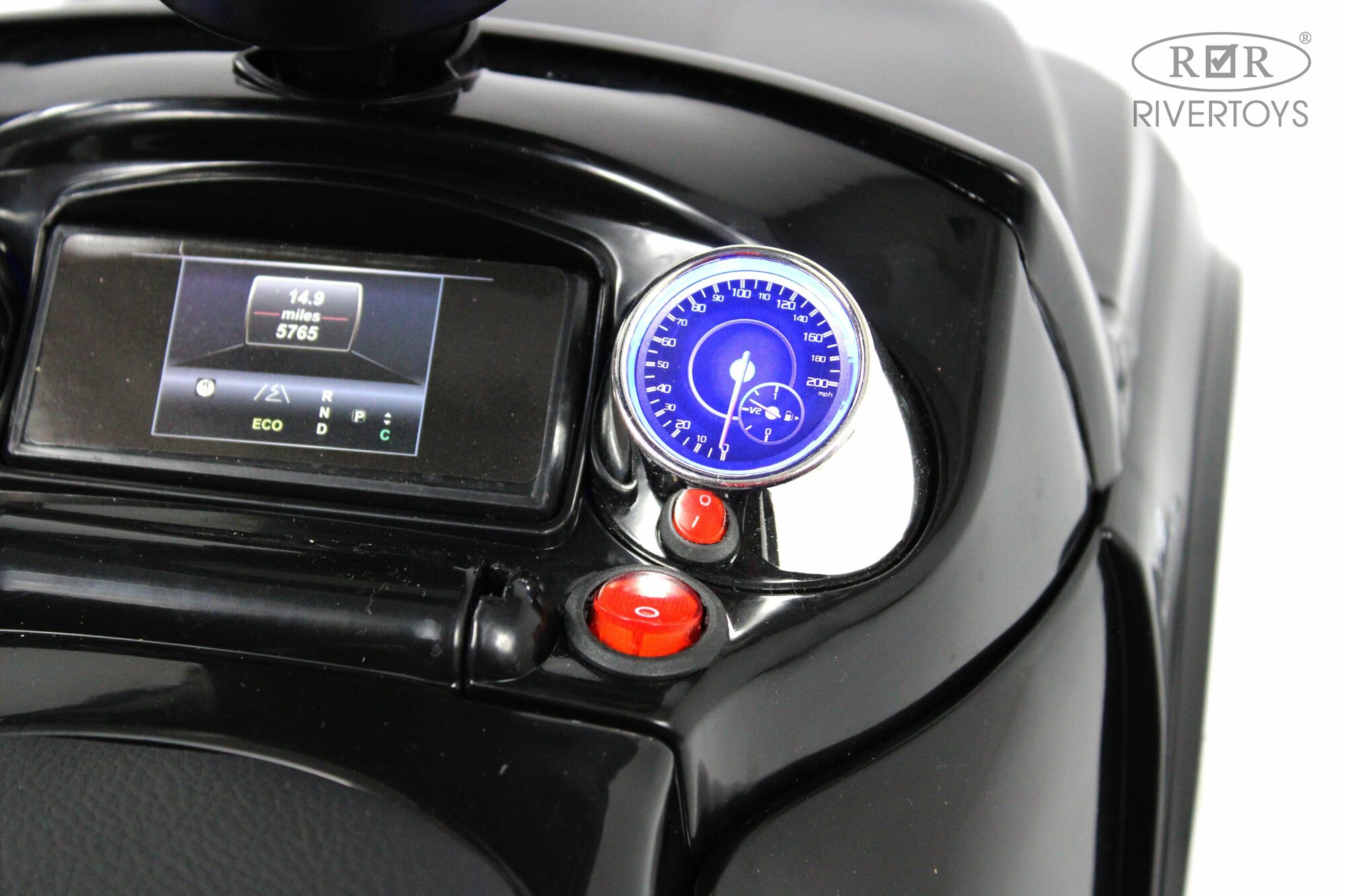 Кожаное сиденье. Резиновые колеса, бесшумные. Руль поворачивается. Есть звук мотора при включении. Горят передние и задние фары. Есть гудок. Есть 4 мелодии. Багажник. Подсветка передней панели. |