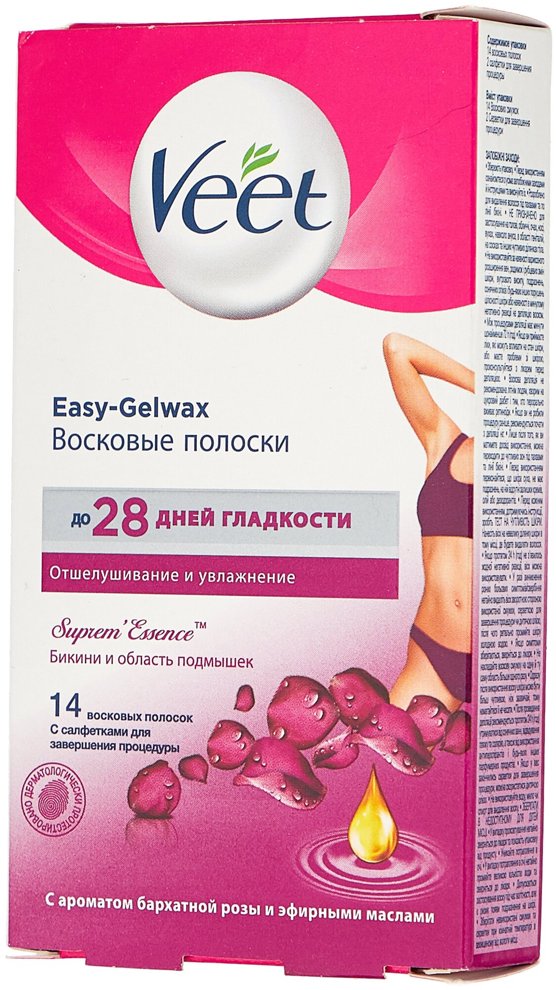 Veet восковые полоски для чувствительных участков тела (линия бикини и область подмышек) с ароматом бархатной розы и эфирными маслами c технологией easy gel-wax 14 шт.