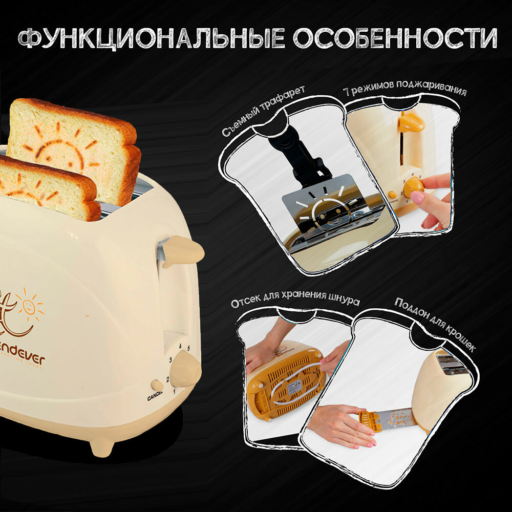Тостер для хлеба Endever ST-107, съемный трафарет для рисунка на тосте / 7 режимов / функции отмены, центрирования / автоматический выброс тостов
